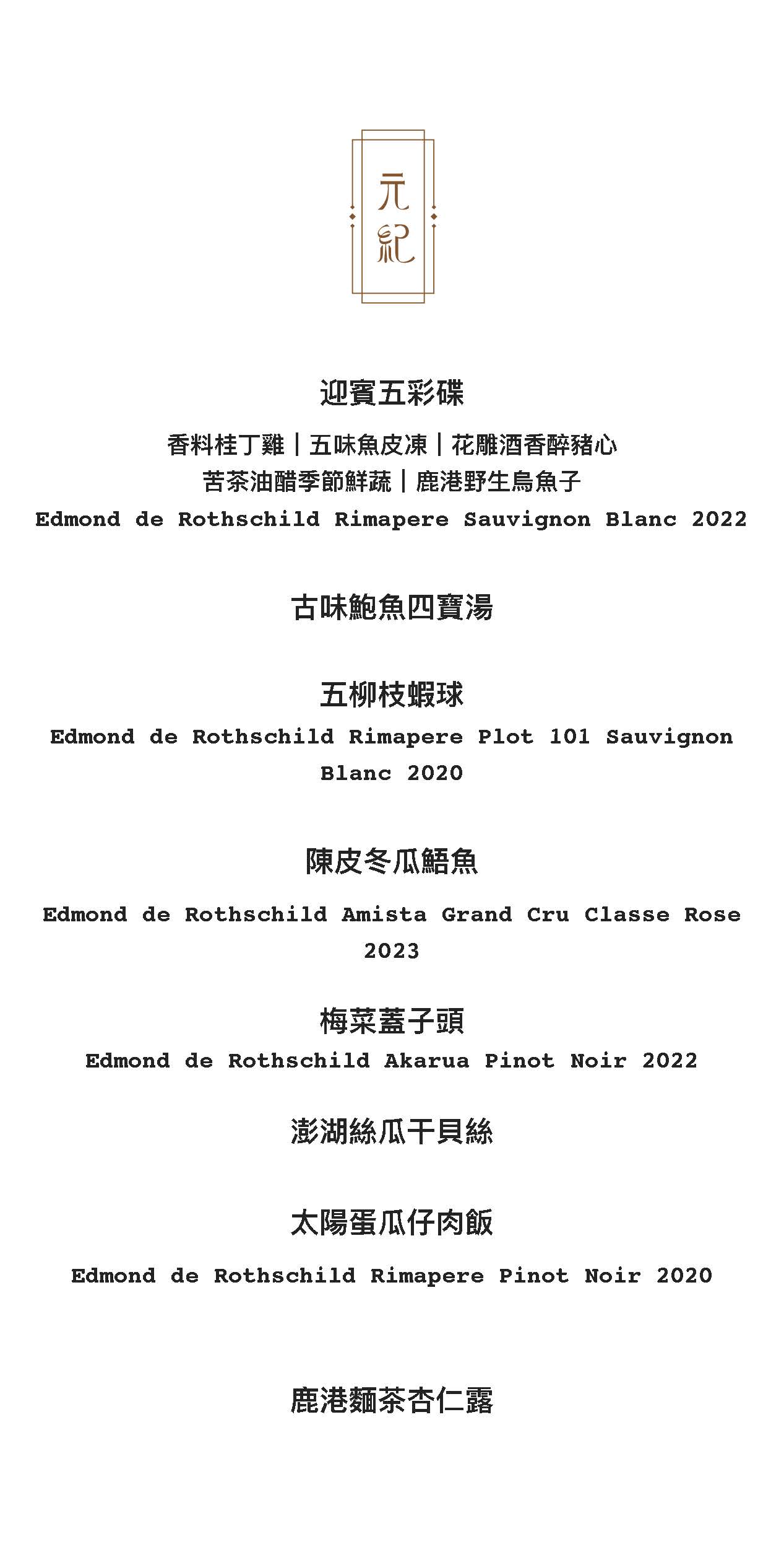 品嚐米其林二星主廚林菊偉主廚掌勺《元紀.台灣菜》以其對台灣料理的熟悉和對細節的極致追求,搭配愛德蒙羅斯柴爾德 (Edmond de Rothschild Rimapere) 的白蘇維濃 (Sauvignon Blanc) ,純粹忠實的反映位於南島東北部 Marlborough 產區的風土特色,散發檸檬、葡萄柚果香和淡雅花香,充滿活力;黑皮諾 (Pinot Noir) 迷人的紅色果實口感則結合了優雅的橡木風味,皆為讓人印象深刻的佳釀。